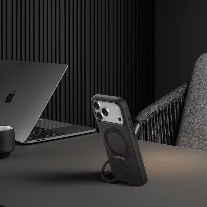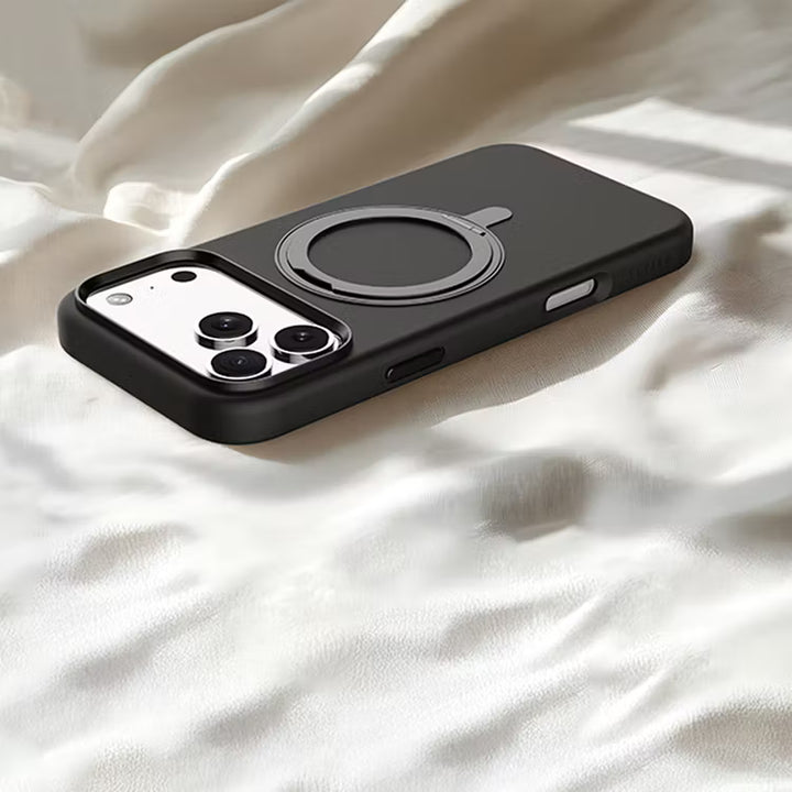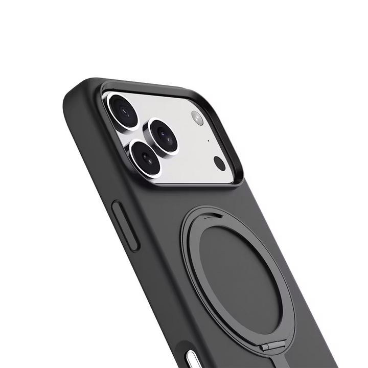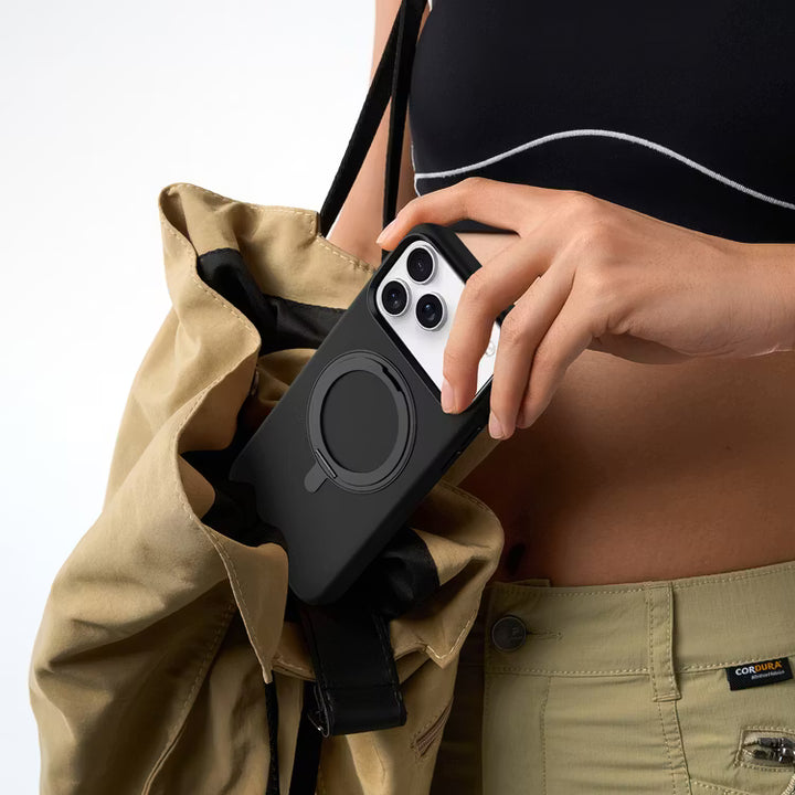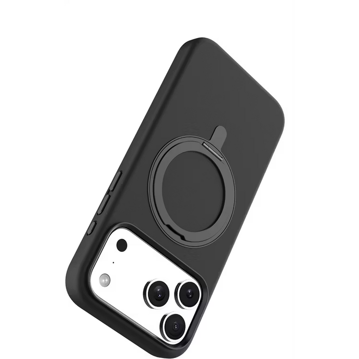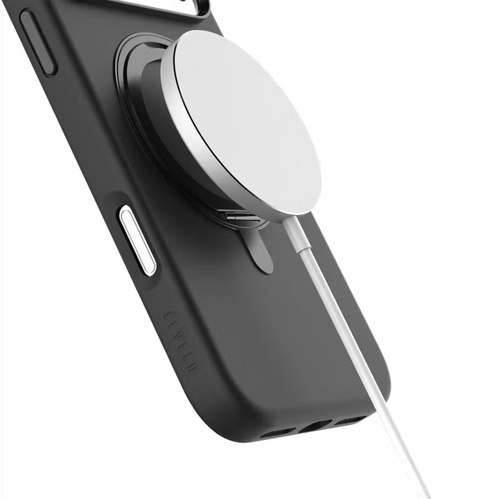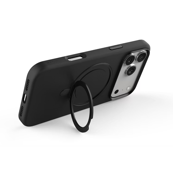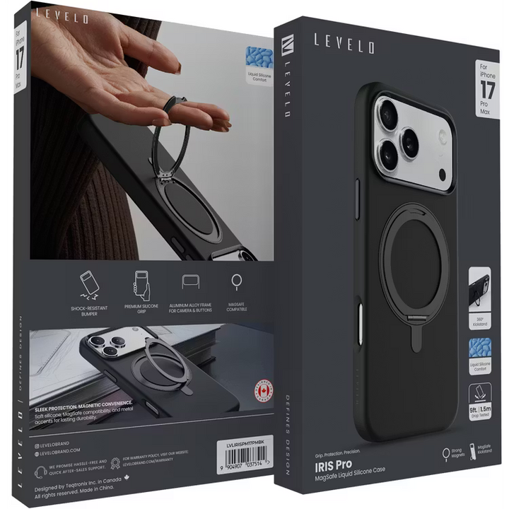 The Levelo Iris Pro MagSafe Liquid Silicone Case in chic black color for iPhone 17 Pro Max combines durability and elegance in one sleek design. This case has metal accents and an aluminum alloy frame. It protects your camera and controls while looking stylish. Your phone stays securely in your hand. The high-quality silicone gives it a nice, non-slip grip. The case provides reliable protection against everyday impacts. Its shock-resistant bumper and drop testing up to 1.5 meters ensure safety. Robust magnets guarantee smooth MagSafe compatibility, making accessory attachment simple. The 360° kickstand rotates for hands-free viewing. You can adjust it for calls or movies, ensuring your comfort. The Levelo Iris Pro MagSafe Liquid Silicone Case offers great protection and easy use. It blends style with practicality perfectly.