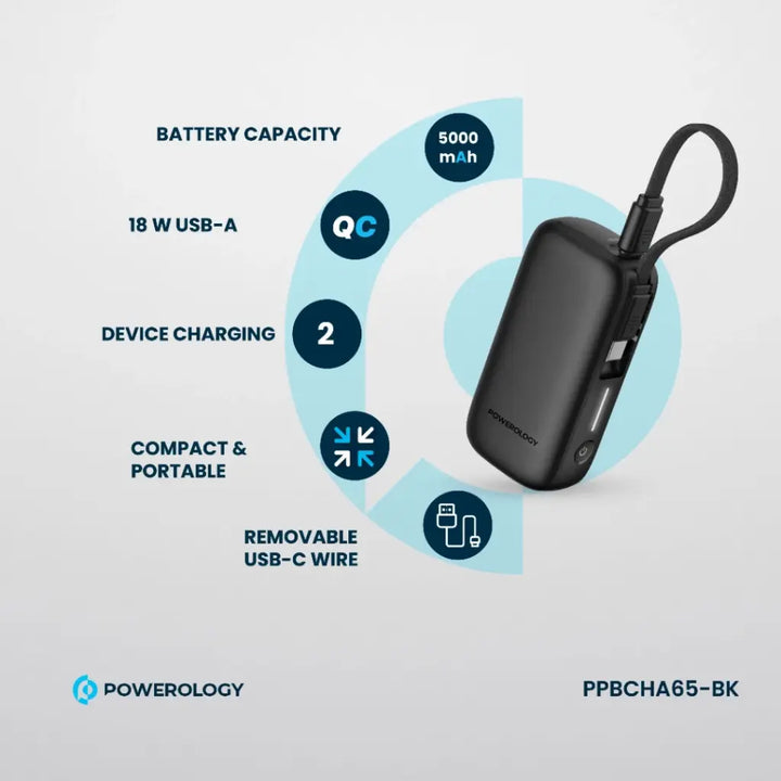 The Powerology 5000mAh Power Bank is a compact, portable powerhouse that efficiently and quickly gives batteries. The cell's capacity is up to 5000mAh (18.5Wh), which can be charged comfortably with everyday gadget power. USB-C inputs have three voltage variants of PD18W (5V/3A, 9V/2A, 12V/1.5A). The above state-the-art USB-C power output rates up to 5V/3A, 9V/2.22A, and 12V/1.67A with PD20W. USB- A has also multiple options such as 5V/3A, 9V/2A, and 12V/1.5A with QC 18W and SCP 10V/2.25A for maximum 22.5W. All cited above yield a peak output of 15W (5V/3A). It also makes the power supply dependably good for smartphones, tablets, and other devices powered using USB ports. Multi-protection overcharging, over-voltage, and even short circuit safeguards for safety with devices using the Powerology power bank.